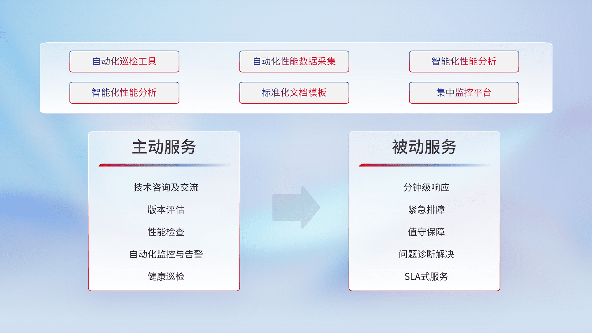 智能化工具和标准化文档,,保障服务质量,,提供主动服务(包含技术咨询、、版本评估、、性能检查、、自动化监控与告警、、健康巡检)和被动服务包含(分钟级响应、、、、紧急排障、、、值守保障、、、问题诊断解决、、、、SLA服务)。。。